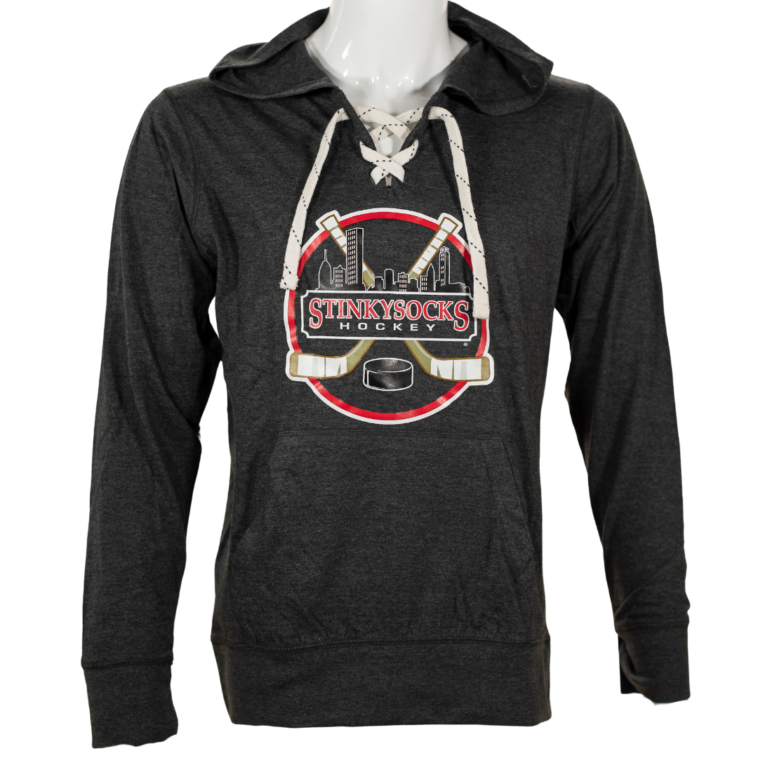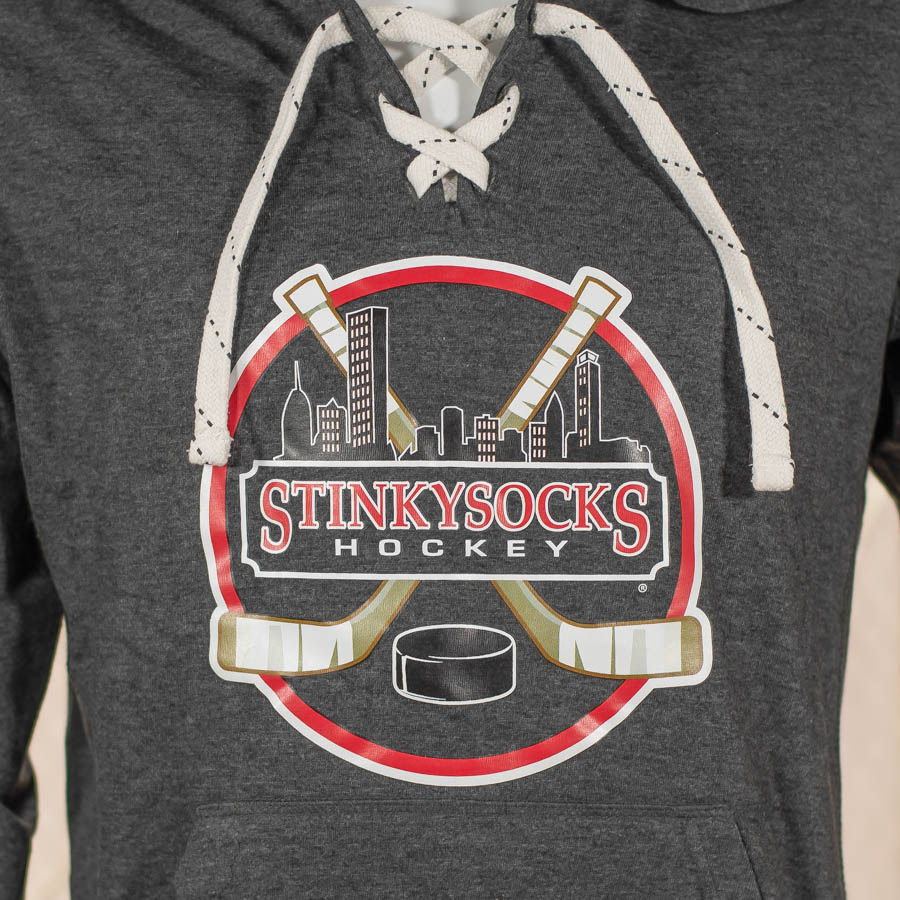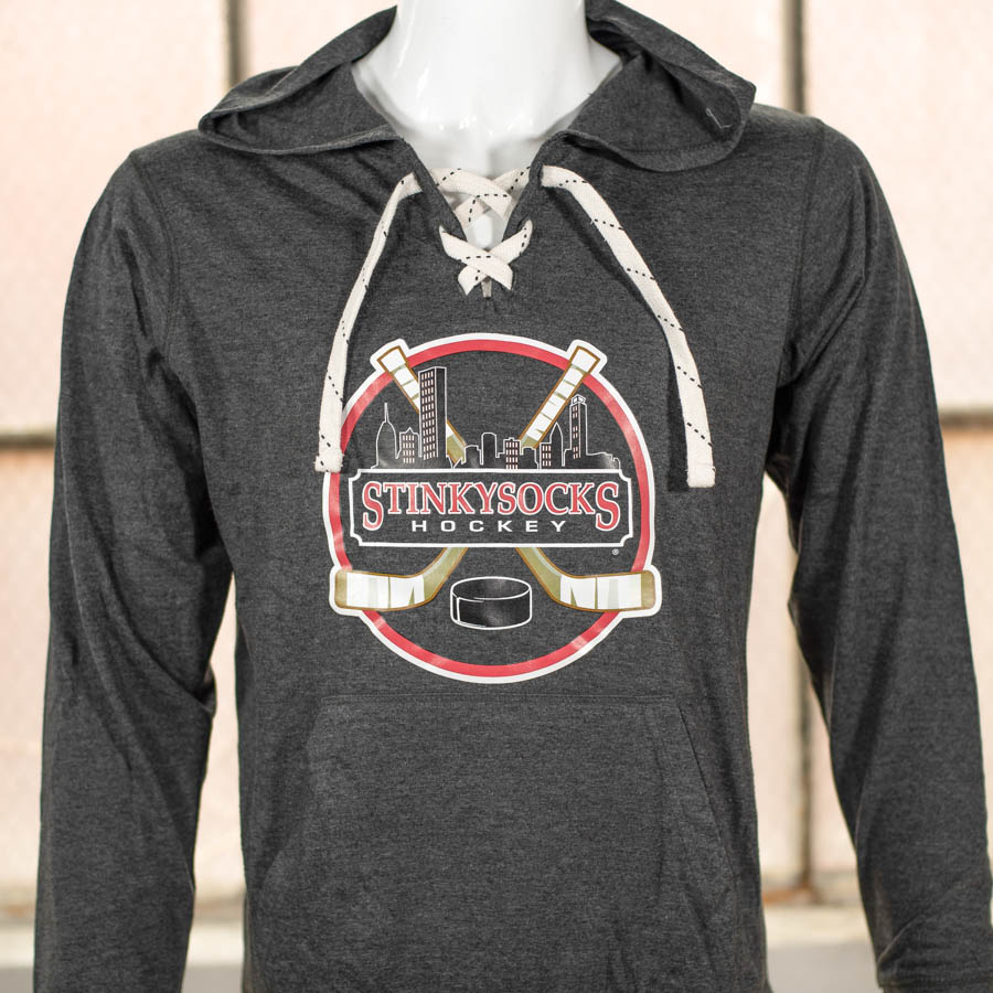 This is a lightweight verison of our classic lace-up, in nice dark grey color. The lighter material makes easy to sport a comfy hoodie in the warmer temps, or any weather for those who heat up easy. This hoodie features a kangaroo pocket, a hockey lace tie at the neck, and the full StinkySocks Hockey logo at the center.