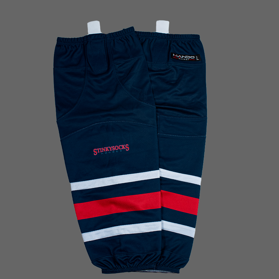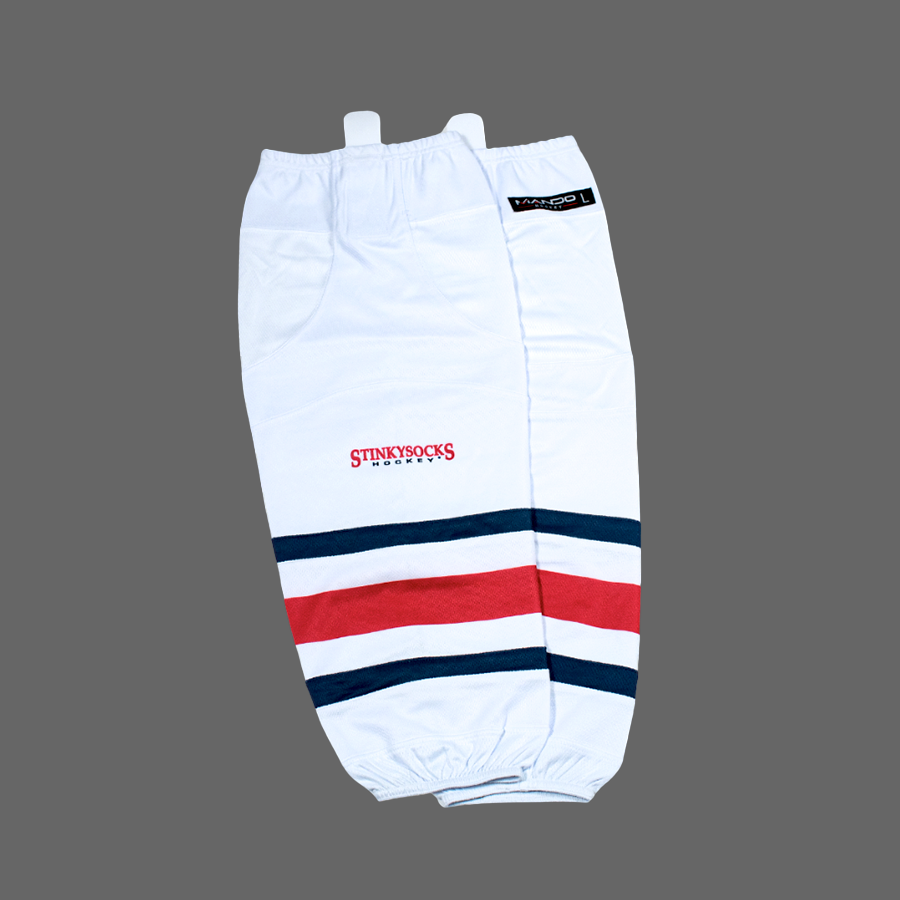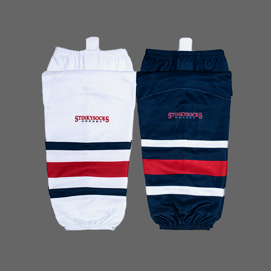 New design for 2021! Complete your SSH uniform. Our socks are made from lightweight synthetics, including knit and mesh materials, that will keep you performing on the ice while wicking away moisture and heat. Elastic closures at the top and bottom ensure an excellent fit. Mando Hockey custom manufactures our hockey socks to our exact specifications. Not too big and not too small, these socks are cut to keep your shin guards compressed to your legs to minimize the need for taping. The sewn-in Velcro keeps them easily attached to your shorts. There is a StinkySocks Hockey logo at center.